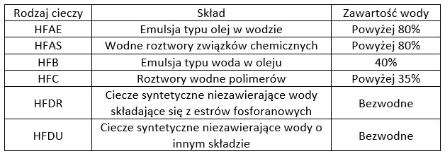 Tab. 1 Podział trudnopalnych cieczy hydraulicznych.